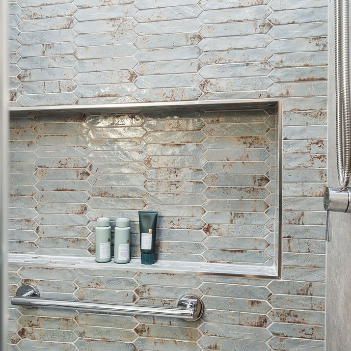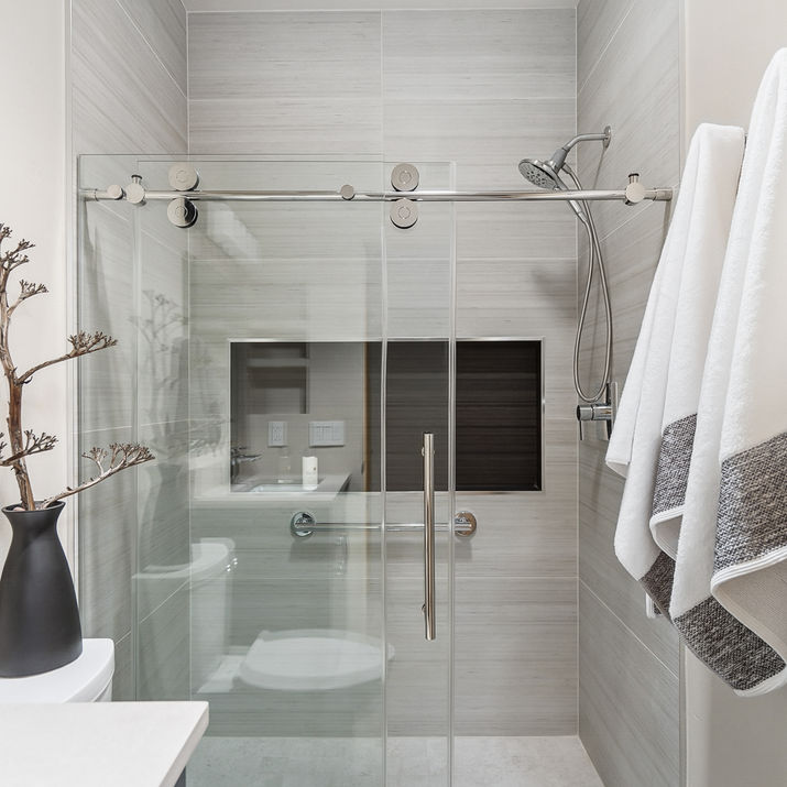 The guest baths continue the theme of refined comfort—one with sleek gray tones and a glass-enclosed shower for a calming retreat, the other with earthy hues and handcrafted tile that add warmth and character. Thoughtful textures and clean lines make each space feel effortlessly modern yet inviting.
