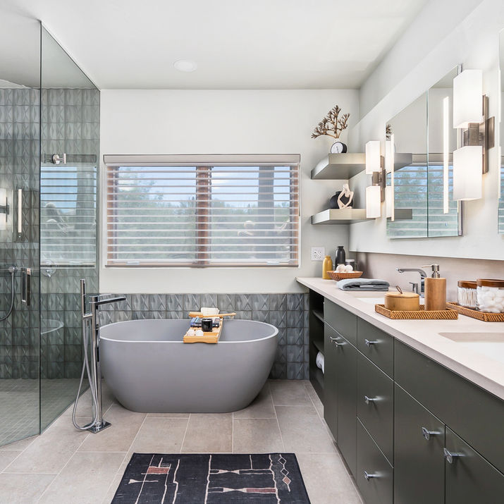 This spa-inspired ensuite is where modern elegance meets everyday indulgence. A sculptural soaking tub steals the show, framed by textured geometric tile for a touch of drama. The custom vanity blends style and function, while warm neutrals and a luxe walk-in shower make this space the ultimate retreat to relax and recharge.